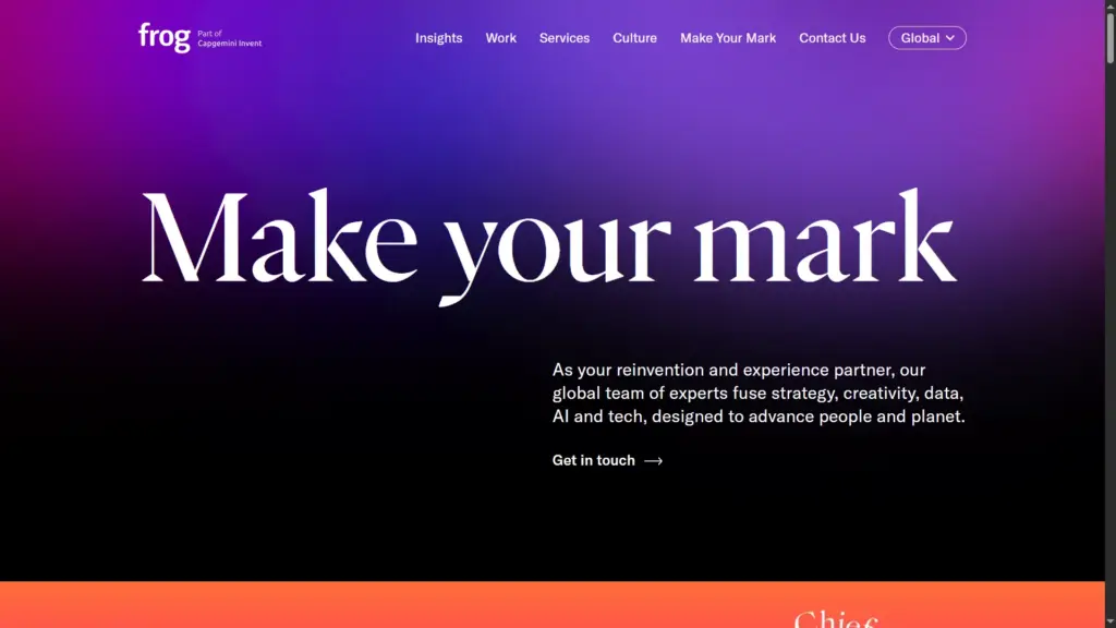 • Integrated Innovation: As part of Capgemini Invent, Frog seamlessly blends design, strategy, and technology to drive digital transformation for businesses worldwide.​